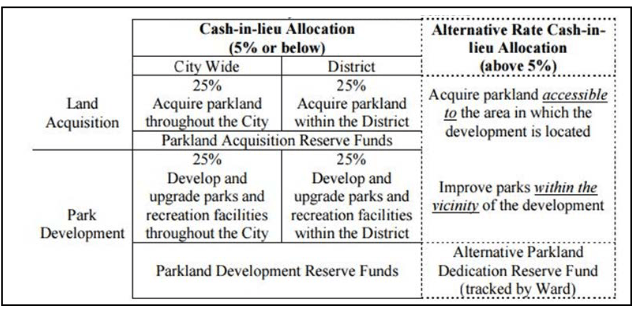 - Amend the cash-in-lieu allocation policy. The City can free up reserve fund money towards area with the greatest need for parkland acquisition
