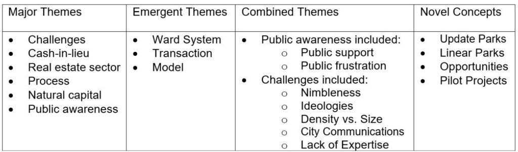 Using existing cash-in-lieu reserve funds is not an easy task. The City of Toronto, for instance, must save up funds to purchase parkland. It cannot finance the acquisition. In other words, it cannot go to a bank and say: “We are $20 million short. Can you give us a loan to buy this parkland, please?” Plus, the City does not move as fast as private actors. These challenges were pointed out by practitioners across all sectors. It was the top theme from the five formal interviews that I conducted during the MRP’s Phase 2 between Fall 2021 and Winter 2022. (Figure 2) The silver lining is that it provides a starting point in the conversation for all parties to address the problem of moving faster to acquire more parkland.